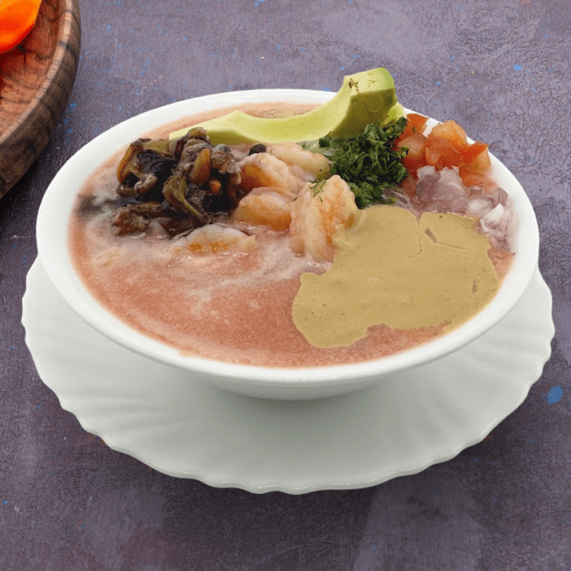 Ceviche de 250 gr hecho con una base líquida natural de tomate fresco, con un mix de verduras (tomate, cebolla y pepinillo), camarón y concha al final una rodaja de aguacate, pizca de cilantro y salsas.
