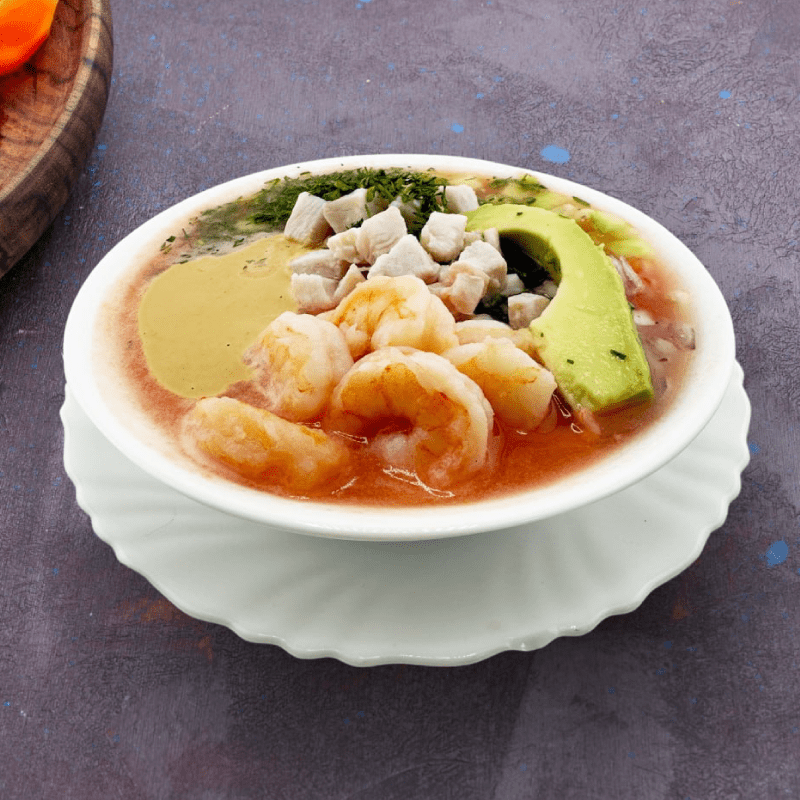 Ceviche de 250 gr hecho con una base líquida natural de tomate fresco, con un mix de verduras (tomate, cebolla y pepinillo), pescado y camarón y al final una rodaja de aguacate, pizca de cilantro y salsas.