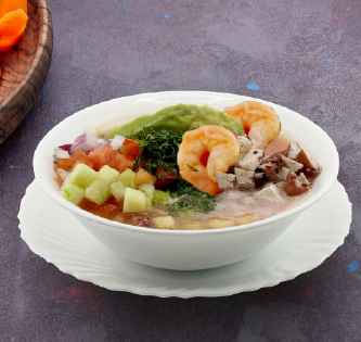 Hecho con una base líquida natural de tomate fresco, con un mix de verduras (tomate, cebolla y pepinillo), con 220 gr de Camarón y Pulpo al final una rodaja de aguacate, pizca de cilantro y salsas.