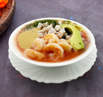 Hecho con una base líquida natural de tomate fresco, con un mix de verduras (tomate, cebolla y pepinillo) con 250 gr de pescado, camarón, pulpo y calamar acompañado de aguacate, pizca de cilantro y salsas.