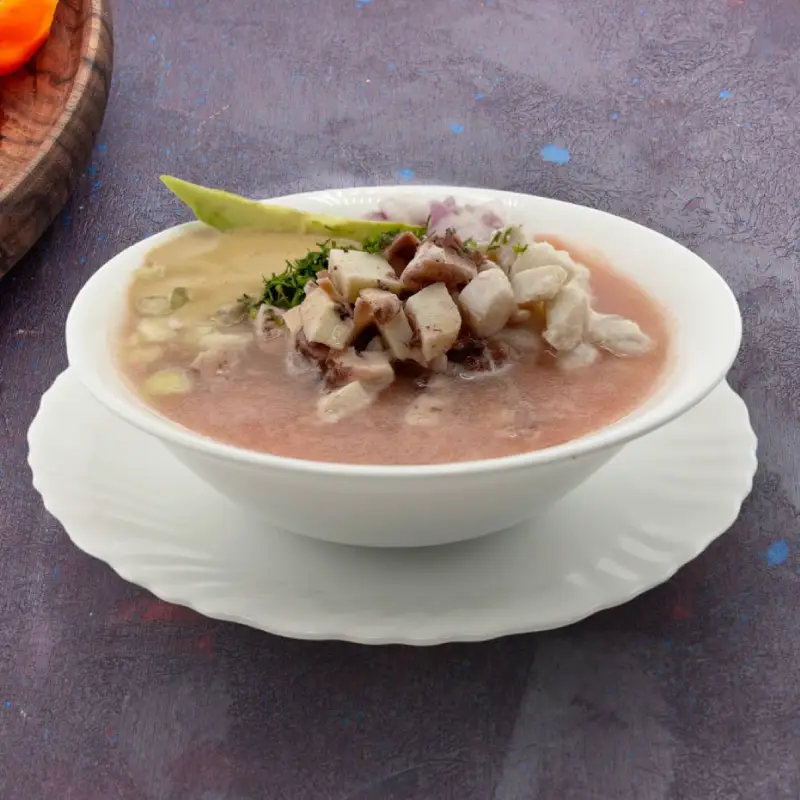 Ceviche de 250 gr hecho con una base líquida natural de tomate fresco, con un mix de verduras (tomate, cebolla y pepinillo), pescado y pulpo calamar al final una rodaja de aguacate, pizca de cilantro y salsas.