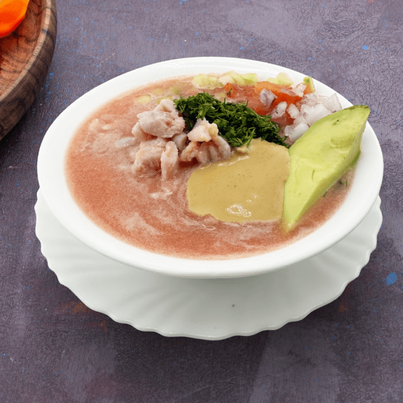 Ceviche de 250 gr hecho con una base líquida natural de tomate fresco un mix de verduras (tomate, cebolla y pepinillo), pinchagua, finalizando con una rodaja de aguacate, pizca de cilantro y salsas.