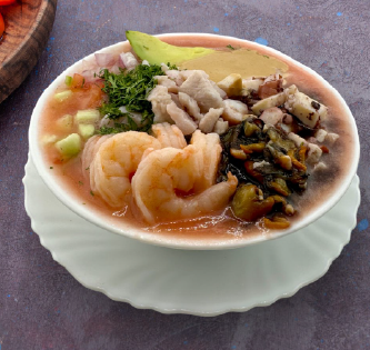 | Ingredientes | Pescado, Camarón, concha, Pulpo y Calamar, tomate, cebolla y pepinillo, aguacate, cilantro. |